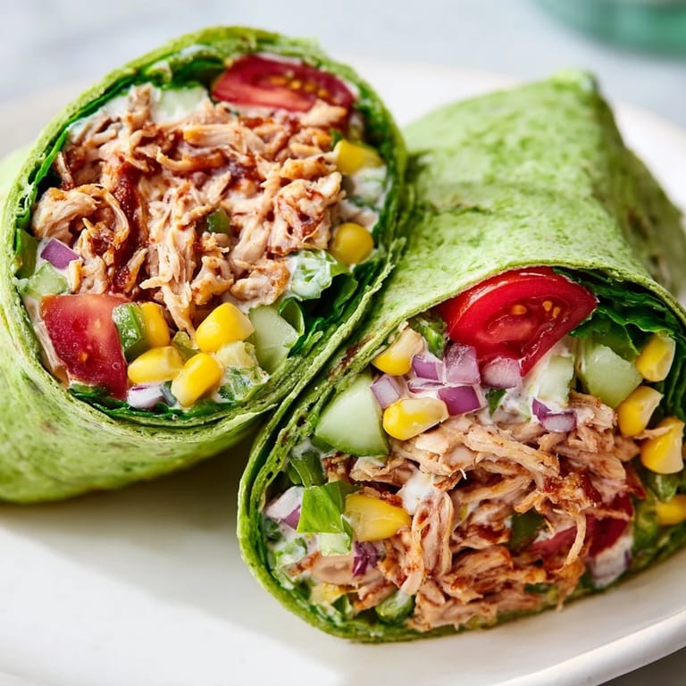 I've played around with this recipe more times than I can count, swapping out vegetables based on what's in the crisper drawer or what's on sale. Shredded carrots add sweetness and crunch, thinly sliced radishes bring a peppery bite, and diced avocado makes it feel more indulgent. If you're not a fan of spinach tortillas, regular whole wheat or even flavored wraps like sun dried tomato work just as well. The core formula stays the same: smoky BBQ chicken, crunchy vegetables, tangy creamy dressing.