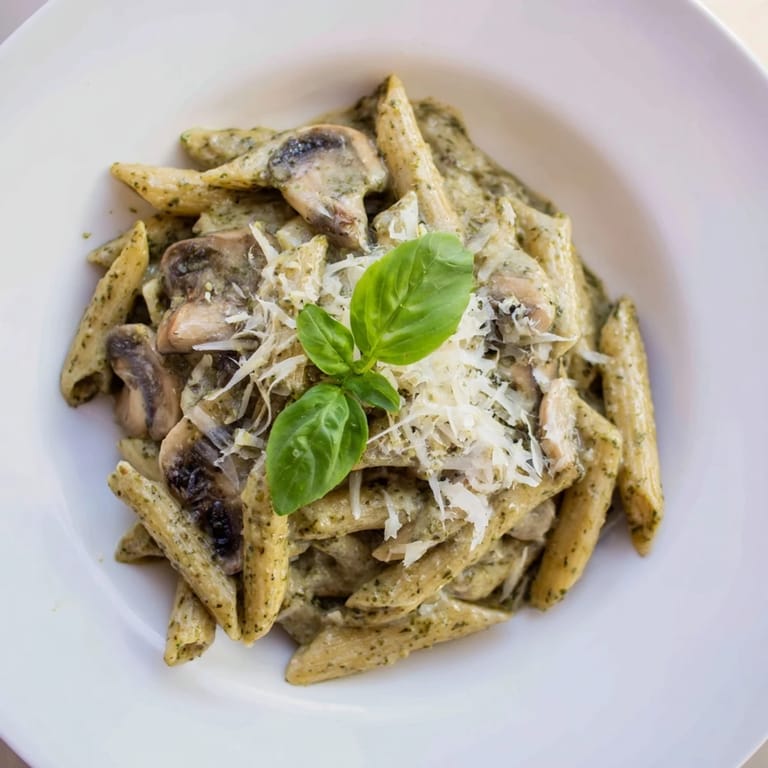 Pin it There was a Wednesday evening last spring when I had exactly twenty-seven minutes before my neighbor was supposed to come over for dinner. I pulled out a box of penne, a container of pesto from the back of the fridge, and a bag of mushrooms that had been sitting there since Sunday. What came together in that skillet turned into something I now make at least twice a month. The mushrooms get golden and almost meaty, the pesto melts into the cream, and suddenly you have a dish that tastes like you spent an hour on it.
